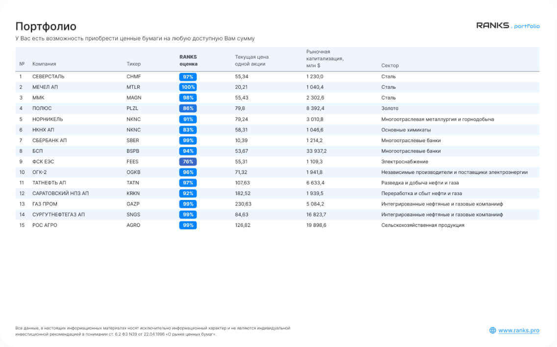 Наилучшие акции добавляются в RANKS. Портфель